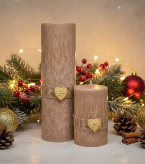 - Dekorace: Svíčka je ručně ovázána rustikální jutovou stuhou, která dodává přírodní šarm. Vpředu je připevněna dekorace ve tvaru srdce, evokující perník.
