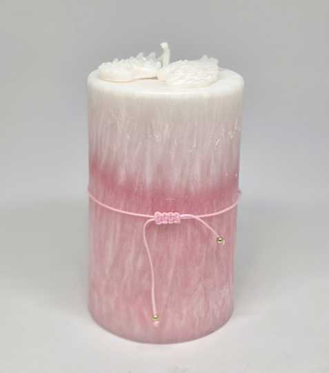 - Harmonie barev: Svíčka ručně přechází z čisté bílé – symbolu čistoty a nových začátků, do něžné růžové, která reprezentuje lásku, soucit a sebelásku.