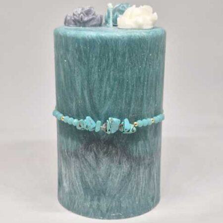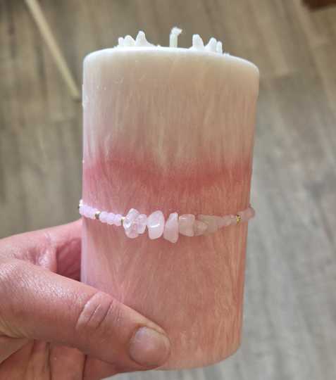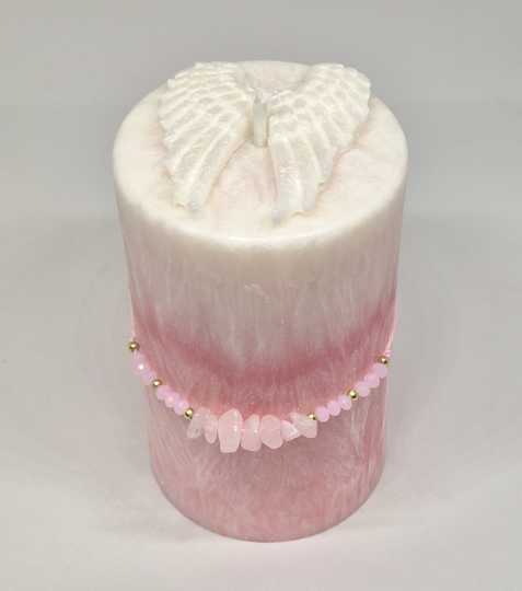 Dva dárky v jednom: Po obvodu svíčky je upevněn náramek z růžových minerálů jako osobní talisman, který vás bude chránit a dodávat vám energii.