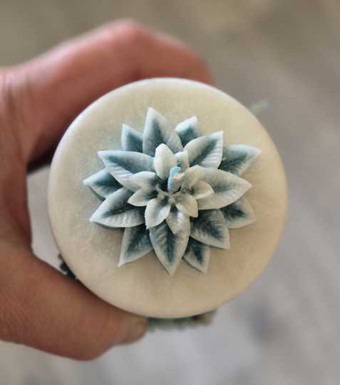 - Květina: Na vrchní straně, u knotu, je usazena jemná květina z vosku v odstínu bílé a tyrkysové. Je připomínkou, že i v jednoduchosti se skrývá krása a síla.