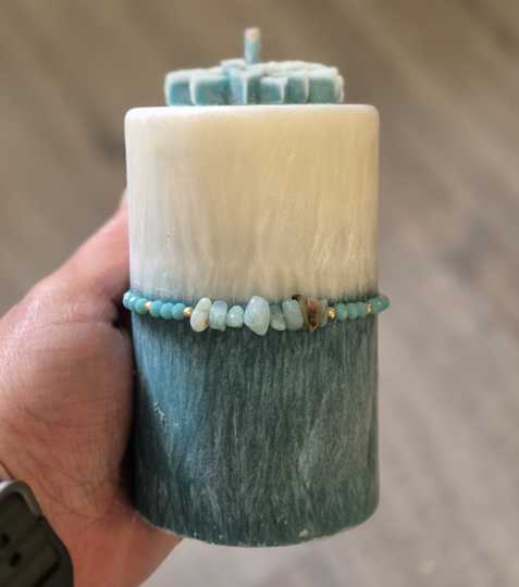 Dva dárky v jednom: Po obvodu svíčky je upevněn náramek z minerálů v odstínech tyrkysové, který vás bude chránit a dodávat vám sílu.